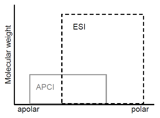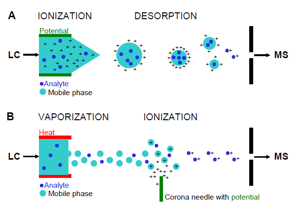 ES and APCI are soft methods of ionization as very little residual energy is retained by the analyte on ionization. The major disadvantage of the techniques is that very little fragmentation is produced. The mass spectra generated by either technique are typically dominated by protonated or deprotonated molecules, [M+H]+ or [M-H]-, depending on the ion mode used and adducts (e.g., [M+Na]+, [M+NH3]+, [M+HCOO]-).