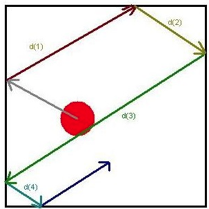 Imagine a ball traveling in a box ; the ball represents a moving molecule. Every time the ball hits a wall, a collision occurs and the direction of the ball changes (Figure 1). The ball hits the wall five times, causing five collisions. Between every two consecutive collisions, the ball travels an individual path. It travels a total of four paths between the five collisions; each path has a specific distance, d. The mean free path, $\lambda$, of this ball is the average length of all four paths.