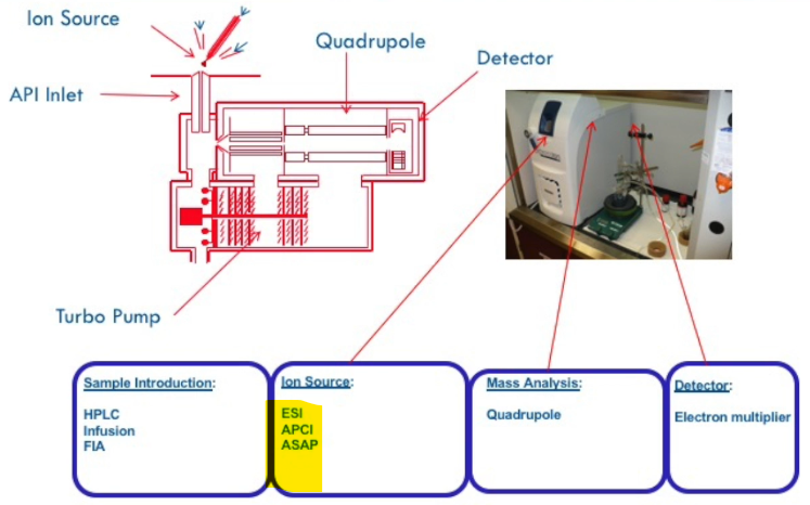 we’ll talk about each of these, the ion source make science either by electrospray atmospheric pressure, chemical ionization, or another approach that we call ASAP that we’ll talk about a simple technique that it does not use HPLC as an inlet system. By the way, there are almost there’s approaching 30 different ways of making ions that what the vast majority are by electrospray or APCI. The others are more esoteric and developing. The mass analysis designed by a quadrupole. We’ll talk more about that. That’s this section right in here. And the detector is an electron multiplier at the end of the ion path. And we’ll talk about each of these components in a little detail in sequence. I like to be very analytical. My wife says I’m anal. I say no, I’m analytical and take this in a very systematic way.