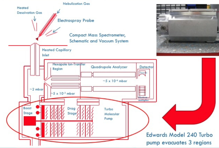 So here is again, a cross section of our mass spectrometer the mass analyzer region, this is what the component the whole component looks like when it’s out of the system. What I want to point out here is that we have three regions of evacuation, there is the first region there’s the second region and there’s the third region. this one turbo pump pumps all three of those regions. This is called the boost stage, the drag stage and the turbo like molecular pump, you don’t need to know or worry about that. But it’s useful to know that one pump is doing a really nice job of pumping this whole analyzer region. And that’s a little unusual, other commercial systems in the past have had two or three different turbo molecular pumps, each one dedicated this region one dedicated to this region and so forth that adds the cost that adds the complexity and we cannot take too much credit other than being smart enough to choose this because this is a commercially available pump that can be that others use and we have chosen to use for this system.