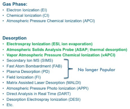 Other techniques in involve invoke what’s called desorption ionization. And there are a variety of them. Some of them are shown down here. But electrospray is essentially a desorbing. The ion is formed in a droplet, and we’re going to see the droplet gets smaller and smaller and smaller. But at some point, the ion is desorbed from that droplet, it’s called I like this term, it’s called ion evaporation, it literally evaporates from the droplet into the mass spectrometer, and that’s the heart of electrospray as we’ll see. The other techniques that I’ve shown in screen that we use on our system available to you is this atmospheric solids analysis probe. This is a simple way of introducing a sample it does not involve LCMS in any way. It says probe that you put your sample on, and you’ll see this operate in the laboratory. And of course, we have vapor atmospheric pressure chemical ionization, or vAPCI, see, as we call it, which you’ll learn about too. other techniques are commercially available. I might add that these FAB Fast Atom Bombardment used to be a detergent, I don’t know if it still exists. But these are no longer commercially available. These were brought out in the late 70s 80s and have come and gone basically, they’ve been put out of business by newer, better ionization techniques. MALDI matrix assisted laser absorption is alive as well, that’s still a very popular technique, we do not provide MALDI for our system. And these other techniques, Atmospheric Pressure Photo Ionization, DART, DESI, and this etc, includes another 25 Different ionization means of doing that. But the most popular across the board are electrospray and APCI techniques.