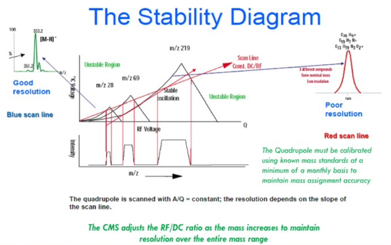 This is an example of good resolution 353.23 And that’s 350.3. So they are they are baseline resolved or maybe 5 or 10% generally resolved. That’s at the low end, it’s easier for a quadrupole to have unit mass resolution. That’s what set is called as unit mass resolution at the low end. Our quadrupole goes to 2000 mass units, and others do too. And any quadrupole has more of a challenge they can do it, but maintaining good resolution high mass at the upper end is more challenging. And so here is an example of poor resolution, not from our system, just as for didactic purposes are three ions in there, and they’re not resolved, you would have to increase the slope of this Scan Line. And if you did, you could then resolve those ions. So that’s what you’re doing when you’re increasing the resolution, the mass resolution, I’m not talking about chromatographic resolution, is sort of analogous, but it’s mass resolution, and auto tune and you are in or your own hands. If you have peaks that are not hopefully this bad off, but maybe you see a shoulder they’re barely resolved, you’re going to improve that by increasing the slope of this line. And that’s called the stability diagram.