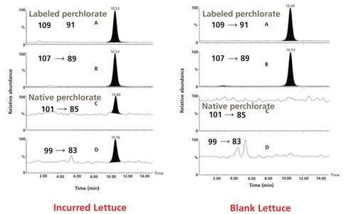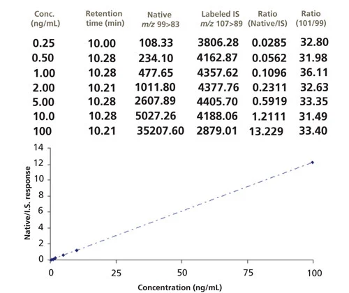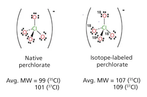 The final example where isotope dilution MS was successfully used was with the determination of inorganic perchlorate (Figure 1a) in foods (18,19). In these studies, a rapid, sensitive, and specific method was developed for the determination of perchlorate anion in foods. The foods included high-moisture fruits and vegetables, low-moisture foods (for example, wheat flour and corn meal), and infant foods. Improvements to existing procedures were made in sample preparation that reduced the sample test portion size from 100 g to 5 or 10 g and the extraction solvent volume from 150 mL to 20–40 mL, and replaced blending extraction–vacuum filtration and its associated large glassware with a simple shakeout centrifugation in a small conical tube. Procedures common to all matrices involved extraction, centrifugation, graphitized carbon SPE cleanup, and ion chromatography–tandem mass spectrometry (IC–MS/MS) analysis. A 75 mm x 4.6 mm Waters IC-Pak Anion HR column was used with a mobile phase consisting of 100 mM ammonium acetate in 50:50 (v/v) acetonitrile–water with a flow rate of 0.35 mL/min. IC–MS/MS, equipped with ESI in the negative ion mode, was used to detect perchlorate anion. An 18O4-labeled perchlorate anion internal standard was used to correct for any matrix effects. Losses of the 16O and 18O atoms from perchlorate were used as transition product ions from the native and isotope perchlorate species, respectively (Figure 1b) and provided a stable calibration curve (Figure 1c) that can be used to quantitate a variety of different food commodities. The method LOQ was 1.0 g/kg in fruits, vegetables, and infant foods and 3.0 g/kg in dry products. Fortified test portions gave 80–120% recoveries. Determination of incurred perchlorate anion residues agreed well with results for comparable commodities or products analyzed by published methods.