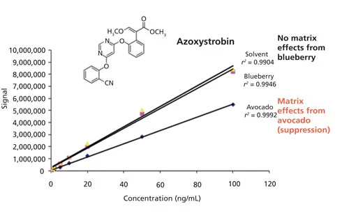 Matrix-matched calibration standards were used to validate a multiresidue method analyzing 209 pesticides in 24 agricultural commodities using the original quick, easy, cheap, effective, rugged, and safe (QuEChERS) procedure and LC–MS/MS analysis (20,21). Using solvent-only calibration standards and matrix-matched calibration standards, it was demonstrated that a minimal concentration of 5–10 μg/kg (ppb) of analytes in matrix is required for the consistent identification of targeted pesticides with two MRM transitions. Method performance was validated by the precision and accuracy results obtained from fortification studies at 10, 25, 100, and 500 ppb and matrix-matched calibration standards. The method was demonstrated to achieve an average recovery of 100 ± 20% (n = 4) for >75% of evaluated pesticides at the low fortification level (10 ppb) and improved to >84% at the higher fortification concentrations in all 24 matrices. Matrix effects in LC–MS/MS analysis were studied by evaluating the calibration curves (1.0–100 ng/mL) obtained from the solvent-only calibration standards and matrix-matched calibration standards. The matrix effect is primarily dependent on the type and concentration of the matrix and pesticide. Matrix-matched calibration standards were needed to compensate for matrix effects, and the effects of the matrix on a particular pesticide are illustrated by the calibration curves of the fungicide azoxystrobin in solvent, avocado, and blueberry (Figure 2). In the case of blueberry, the matrix had very little effect on azoxystrobin since the calibration curves between blueberry-matched and the solvent-only standard of azoxystrobin are essentially equivalent. However, when comparing the avocado-matched calibration curve with the same solvent-only calibration, suppression is observed for azoxystrobin because of the lower signal intensities. The matrix-matched (in this case, avocado-matched) calibration curve was used to identify and quantitate pesticides residues in avocado, and similar matrices are used to determine accuracy and precision results in validation studies. In this multiresidue pesticide validation, concentrations ranging from 2.5 to >1000 ppb in a variety of agricultural samples demonstrate fitness for screening, quantitation, and identification applications.