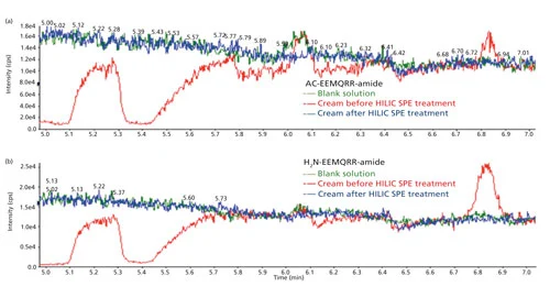 Sample cleanup can reduce, if not eliminate matrix effects. As discussed in the previous section, sample cleanup can benefit SIDA and LC–MS analysis by removing potential matrix components that may interfere with the analysis of the chemical of interest. A study involving the simultaneous determination of hexapeptides (Ac-EEMQRR-amide and H2N-EEMQRR-amide) in antiwrinkle cosmetics by HILIC–SPE preparation and HILIC–MS/MS, involves a rapid method for the simultaneous determination of Ac-EEMQRR-amide and H2N-EEMQRR-amide in cosmetic products (23). Samples showing serious ion suppression were further cleaned up using HILIC–SPE before HILIC–MS/MS analysis. Stable isotopically labeled peptides, corresponding to the above two peptides, were used as internal standards to correct for loss of recovery and matrix effects.