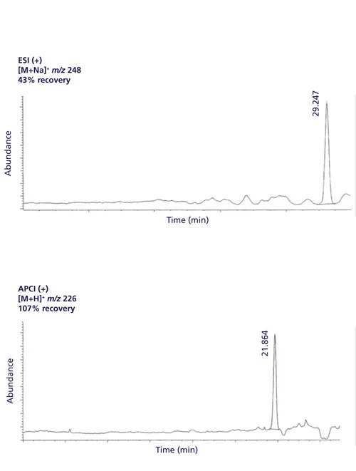 Another way to compensate for matrix effects is to change interfaces from ESI to atmospheric pressure chemical ionization (APCI). Figure 4 shows an LC–MS chromatogram of 50 ppb methiocarb in an orange sample analyzed by both ESI and APCI. When analyzing the sample using external standard in solvent calibration, the apparent recovery was 43% when using ESI in positive mode (ESI+). However, the apparent recovery dramatically improved to 107% when changing from ESI+ to APCI+ (unpublished results). This result is consistent to Souverain and colleagues (1), where APCI appears to be less susceptible to matrix effects than ESI. However, ESI is more popular than APCI because of its sensitivity, and from our experience, ESI is typically fivefold to 10-fold more sensitive than APCI for many pesticides.