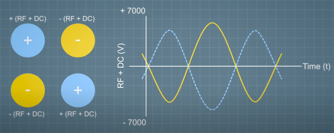 Static potentials or DC voltages, and alternating potentials or RF voltages are applied to the quadrupole rods with one pair of rods having the opposite polarity to the other pair. These voltages create a fluctuating electric field between the rods.