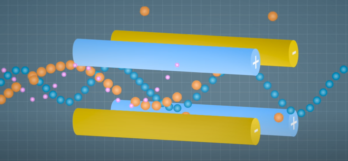 So a quadrupole is a mass analyzer, and it consists of four parallel rods arranged around the central axis as shown. Static potentials or DC voltages, and alternating potentials or RF voltages are applied to the quadrupole rods with one pair of rods having the opposite polarity to the other pair. These voltages create a fluctuating electric field between the rods. The field oscillates as shown, typically at frequencies of approximately one megahertz.
