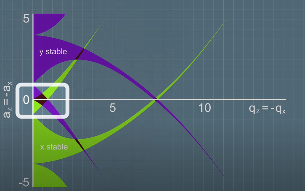 So plotting this gives the following. Obviously, for an ion to make it through the quadrupole it needs to be stable in both the x and y axis. And from this plot, we can see that there are several regions where the stability zones overlap. But all commercial quadruples use what's called the first stability region, mainly because this is where the voltage requirements are the lowest.