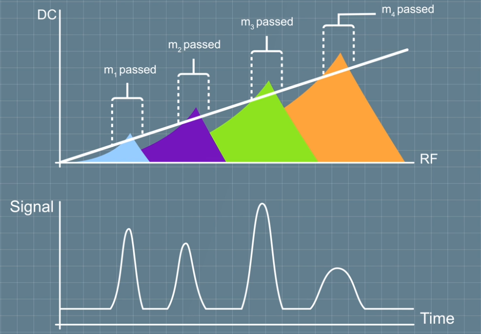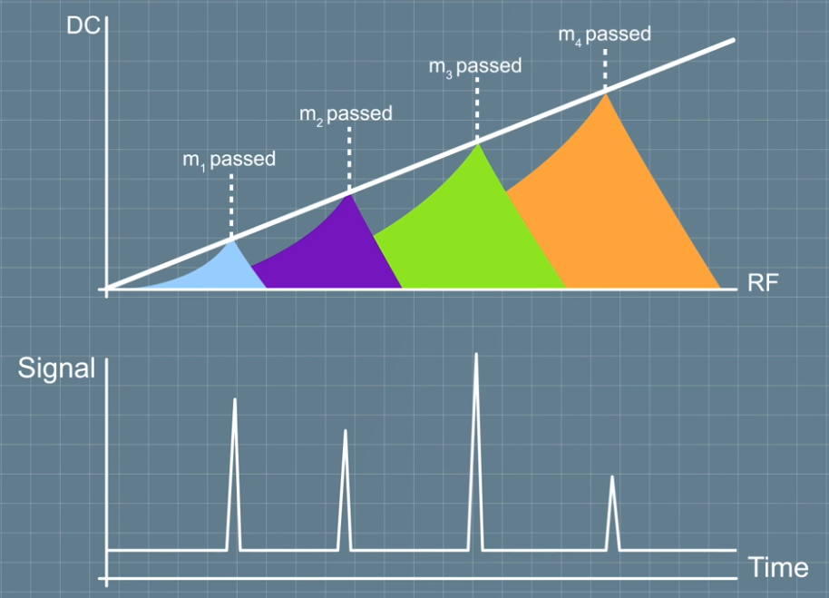 Different ions can pass through the quadrupole and won’t strike rods under different ratios of the RF and DC voltages. As the the DC to RF ratio is increased linearly with time, the ions of that particular mass are transmitted through the quadrupole to the detector.