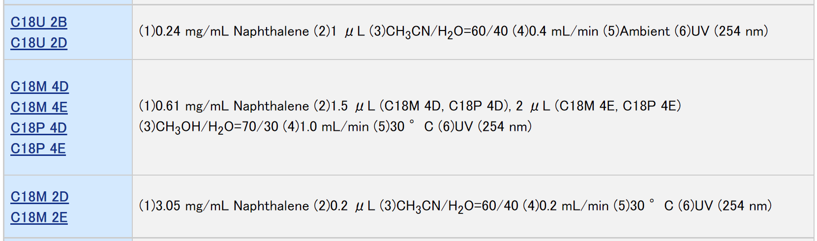 To check the deterioration of column performance, measure the column plate number and compare it with the number written in the inspection data sheet which is attached to the column. The test conditions for calculation of the plate number is determined for each column type and shown in the table below.