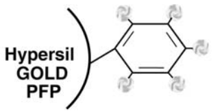 Hypersil GOLD PFP Columns: Fluorinated phases for highly selective reversed phase chromatography • Fluorinated phase provides unique selectivity • Extra retention and selectivity for fluorinated and chlorinated compounds • Excellent selectivity for polar nonhalogenated compounds with nitro, hydroxyl, carboxyl and other polar groups • Shape selective for structural isomers • Use typical reversed phase solvents and conditions