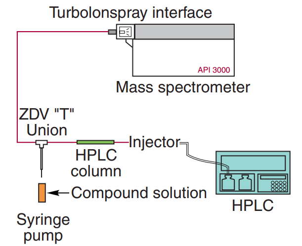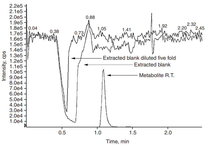 A useful method to assess matrix suppression is postcolumn infusion of an analyte into the MS detector. The extracted blank matrix is injected by an autosampler onto the analytical column. The setup is shown in Figure 3. The purpose of postcolumn infusion with analyte is to raise the background level so that the suppression matrix will show as negative peaks. This setup has been successfully used to identify and troubleshoot matrix suppression peaks.