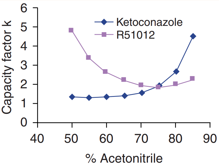 On-column retention. Reversed-phase columns do not always behave in a “reversed-phase” way. The characteristics of the analyte, the column, and the mobile phase can interact with unexpected results. For example, Figure 1 shows that when organic content of the mobile phase composition was increased (a desirable characteristic for improving sensitivity), the capacity factor (k') decreased initially but increased after the deflection point. That system demonstrated an initial reversed-phase mode with primary retention because of hydrophobic interaction between the analytes and the alkyl chains. It reverted to normal-phase where the primary retention was because of hydrophilic interaction between the analyte and the residual silanol groups. That kind of dual retention behavior was observed for various analytes on different brands of reversed-phase columns. Even the extensively end-capped reversed-phase column had at least 30% nonendcapped residual silanol groups. Analyte on-column retention, therefore, depends on the characteristics and interactions of the analyte, the column, and the mobile phase.