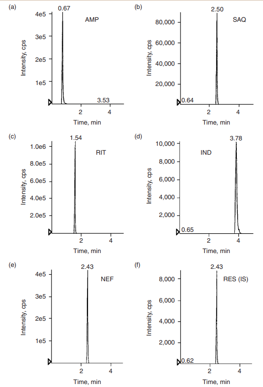 Silica columns demonstrate excellent stability. Typically, one column can be used for at least 500 injections of extracted samples. Figure 2 shows column stability of the LC/MS/MS analysis of ribavirin in human plasma after 350 injections. Even with the protein precipitation extraction method, no retention-time changes were observed. The combination of an aqueousorganic mobile phase and a silica column also demonstrated an excellent, reproducible gradient elution. Reequilibration time was comparable with that of the reversed-phase column. Table 2 lists retention times for four consecutive injections of five different protease inhibitors. The resulting chromatograms demonstrate excellent peak shape and resolution, shown in Figure 3.
