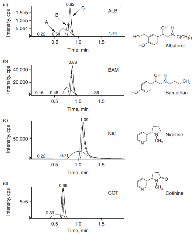 A trend toward faster, more efficient LC/MS/MS has prompted the use of columns with smaller dimensions (50 μm x 2 μm). In contrast to conventional columns (250 μm x 4.6 μm), one column offers advantages that include faster analysis time, better concentration sensitivity, and lower solvent consumption. However, when smaller quantities of packing material are used, the chromatography can be more easily disturbed. Mismatches between the injection solution and the mobile phase are a common problem in compounds that demonstrate early elution peaks (21).