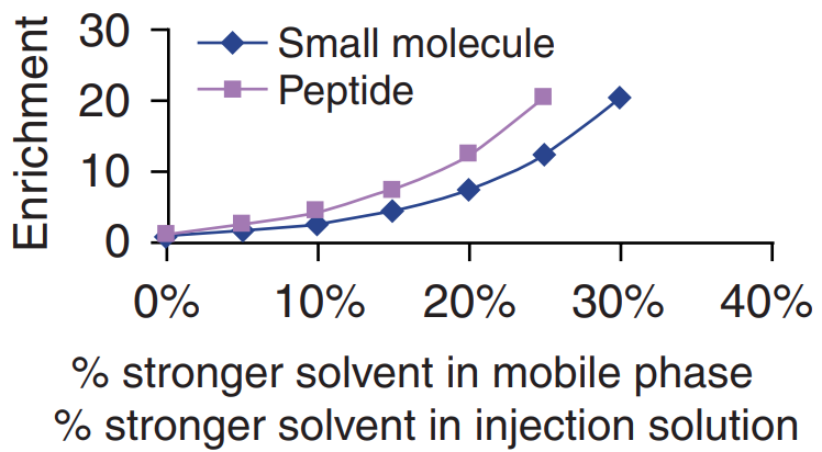 Choosing a reconstitution solvent compatible with the mobile phase can increase sensitivity. When the injection solution has a weaker eluting strength than the mobile phase, the effects of the injection solution on peak shape and chromatography efficiency can be enriched. Figure 4 shows a typical enrichment profile. Maximum chromatography efficiency can be achieved using injection solution at the weakest elution strength. From a practical point of view, better chromatography efficiency can be obtained by diluting the sample with the weaker component in the mobile phase and increasing the injection volume.