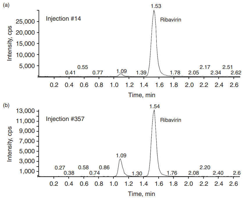During LC/MS/MS method development for analysis of a nucleoside compound and its metabolite, lower and inconsistent signals of the metabolite peak were observed. An aqueous–organic mobile phase and a silica column were used. The extraction method was a simple protein precipitation. The lower signal was due to matrix suppression, which was confirmed by postcolumn infusion portrayed in Figure 4. A broad suppression band was observed around the analyte peak. (1) The problem was overcome by diluting the extracted sample five-fold with the weaker elution solvent, in this case, acetonitrile. The suppression was no longer observed, and the method has since been validated and successfully used for routine sample analysis.
