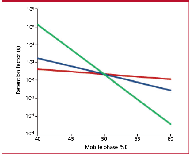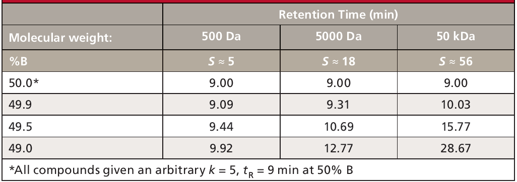 where MW is the molecular weight (Da). Thus for a 500 Da analyte, S ≈ 5.6. If we consider S ≈ 5 as an average for sub-1000 Da molecules, we can then estimate how k changes with %B with