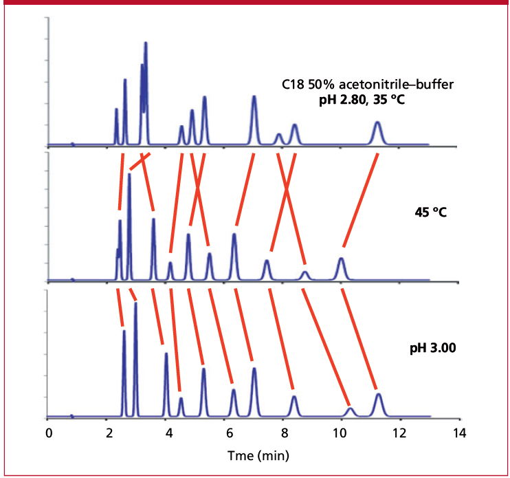 A change in the mobile-phase pH can have a dramatic effect on the appearance of the chromatogram when ionizable compounds are present, but it makes no difference for neutral samples. The behavior of retention with a change in pH will vary depending on how close the mobile-phase pH is to the pKa of the analyte, and in any case, is not a linear relationship, so a general rule of thumb for the effect of pH on retention is not possible. The lower chromatogram of Figure 2 illustrates how sensitive retention can be to changes in pH. A change in pH of 0.2 units gives similar retention changes as a 10 °C change in temperature for this sample of weak acids and bases. Typical laboratory practice of adjusting the mobile-phase pH with the help of a pH meter can result in errors of ±0.1 pH units, so special care needs to be taken if the separation is particularly pH sensitive, as is that of Figure 2. To minimize pH-related problems, use buffers within ±1 unit of their pKa, make buffers by blending equimolar portions of acid and base, ensure that the buffer is sufficiently concentrated (usually 20–25 mM is adequate) Good Lab Practice, and make sure to use a column oven.
