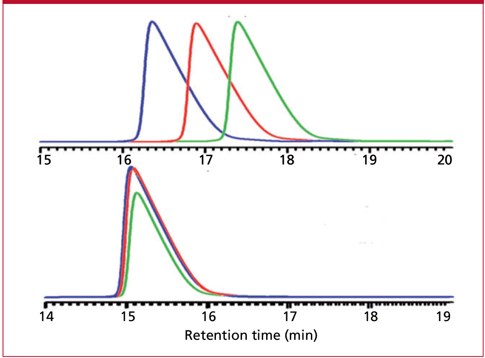 Linear plots, as in Figure 1, are also observed if you plot log k versus reciprocal temperature (in kelvins [K], where K = °C + 273). This means that small changes in column temperature can also affect retention times. A rule of thumb for small molecules is that retention changes by ~2% for each 1 °C change in temperature. In Figure 2, you can see that a 10 °C change in temperature changes the retention of the last peak from approximately 12 min to 10 min, as expected. Most workers know that retention can shift with a change in temperature, but many overlook the fact that relative retention also can change. In the (specially selected) sample of weak acids and bases of Figure 2, there are three reversals in retention for a 10 °C change in temperature. Smaller changes in temperature will have smaller, but noticeable effects on the appearance of the chromatogram. Such problems can be exacerbated by two common factors. Operation with the column at ambient temperature can result in several degrees change in column temperature during a single day, with subsequent retention shifts. In my observation, the temperature of the mobile phase within the column can vary several degrees from the column oven setting and if the oven is not properly calibrated, or of different design, switching from one column oven to another can give similar temperature differences. Usually, temperature differences cause shifts in retention times of all peaks to earlier or later times, and small adjustments in the temperature setting can correct for instrument-to-instrument differences. Because of the wide variation in ambient temperatures that are possible, I strongly recommend that you always use a column oven. Good Lab Practice