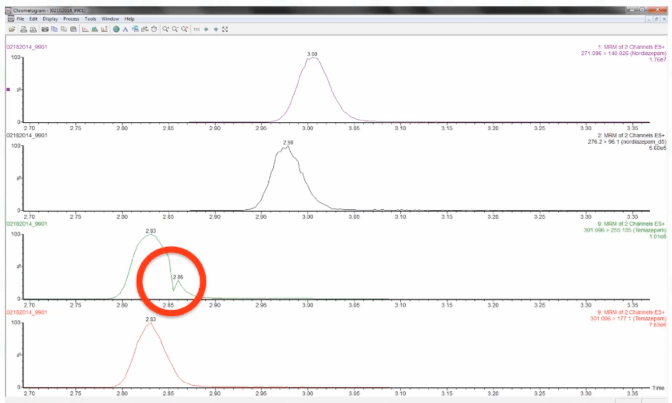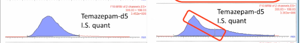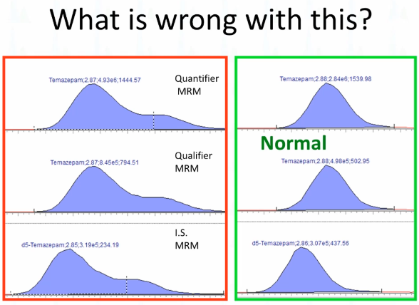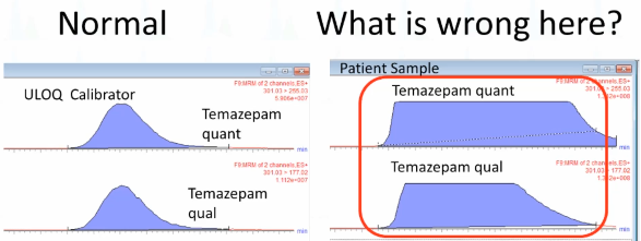 What's this? Why does this look like somebody took a bite out of it? So the retention time is the key. What do we know about ESI Ionization? Is there enough charge to go around all the time? No, there's not enough charge to go around. Right? We say that we have ion suppression. And so here what's happening is the Temazepam is causing `ion suppression` at the internal standard. Does that make sense to everybody? And it's for a very limited part of time, it's well this is eluding. So it starts out normal and then the Temazepam comes up and the internal standards kind of, oh, I'm lost. I don't have enough. I don't get enough charge. And then as soon as this goes out, then it starts to be normal again. We see this a lot with methamphetamine too, because methamphetamine comes at such high concentrations. So this is obviously something that you need to dilute or Before you analyze it again. But does that make sense to everybody, when you see this odd peak shape, we always think of `ion suppression` is coming from the matrix. But you can also get ion suppression from another analyte. In the method, sometimes we would see this odd shape, but you can't see any matching peak that's coming off. What would that say to you if you saw a shape like this, but there was nothing out saturated that was around what might be going on. When you design an MRM method, are you looking at every single thing that's in your sample? No, you're not. So what do you think might be going on? If you see that kind of a picture? So what? could `the matrix effect` that's what we that's what we would often say is that there's probably some other large drug like an antibiotic or something in there, that's coming off at that time, we can't see it. But it's still stealing charge away from our peak that we want to measure, right.