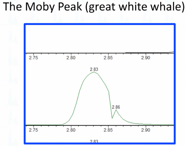 And if you come from the US, you know that everybody has to read at some point, when you're going to school, a Herman Melville's Moby Dick, and it's about a whale. And I think this looks like a whale story. So I call this the Mobi peak, the great white whale. And we see this on our Waters TQS system, very reproducible, sometimes for a whole batch where we've had a slight shift in retention time. And this lines up perfectly with where there is an end of a function, or what is called a period with AB Sciex. And so what it seems like to us is that when there's especially when there's a lot of functions lining up or starting, and it happens at a certain part of the peak, you'll have a signal drop out, it's like there's a delay in passing of the signal from the mass spec to the LC. If you smooth your data, you will never see it. if you don't smooth, you'll see it now. And then the current version that we're using SCN 905 MassLynx isn't supposed to have that. But it does create some very interesting peaks.