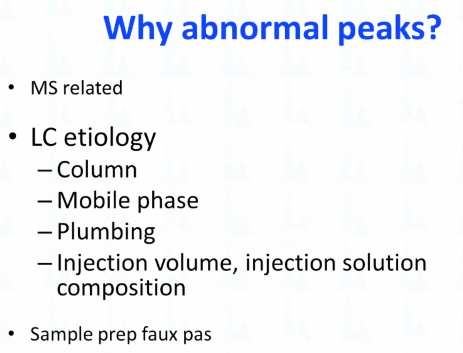 So of the possible things that can cause an abnormal peak, in my experience, it's very heavily coming from the LC very just occasionally, is it going to be ms related? And I've kind of called it a sample prep faux pas, because if you did your method development work acceptably, then it shouldn't happen from sample prep unless somebody makes a mistake.