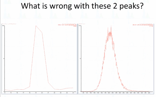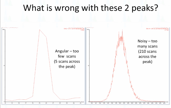 Okay, so what is wrong with these two peaks? How about this one on the left? Do you think that looks like a normal peak? What don't you like about that peak? What's wrong? Right, so it's very `angular looks geometric`. Right? How about this one over here? Anyway, anybody ever seen that before? Took me a long time to finally realize what it is? This is too few scans that's five scans across the peak? This is too many that's 210 scans across the peak? And maybe we'll you would know, my assumption is that essentially, you just have a lot of noise. I mean, so many things are arriving at that time that there's variance, but signal averaging is not good enough over that shorter. Yeah, yeah. So this is like if you have a two millisecond dwell time or something like that, and it kind of fat peak. Of course, I, these were generated mostly by my mistakes, that's where they get all right. So this is the scenario that we're talking about, which is that our dwell time is set too long. And so what I want everybody to remember is that the mass spec, it has a short attention span, if you like, so it looks here. And then for the rest of this time, it's looking at the other eight, nine or MRMS in this method. So here was MRM one, and then because it's looking elsewhere, it doesn't see what's happening until it gets back and looks again and by this time, we've already gotten almost to the apex of the peak. Okay, so that's what's happened when your dwell time is not right. And this problem, I would say, is much more typical and much more of a problem than this.