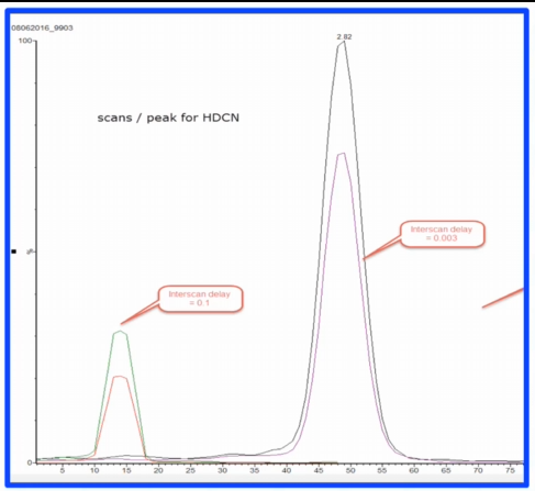 And if you look at this problem, now this axis is scan number rather than time, okay. And that's where it really stands out when I first pulled this up, and I forgot that I had left it in scan number. I'm like, why? that looks like they're different retention times know, what this is showing you is that for this particular period of time, the mass spec was scanning. And here when the when the Interscan delay was set too long. That's that flat top. So it's only eight, about eight scans across the page. Okay. Here where it normally is. It's now from about 40, to about 60. There's about what 28 or something or 18 across the peak. So just want to point out that it's not all about dwell time, this is a pretty unusual problem, but it can happen. The interesting thing is with this method, the early eluting peaks in our method were completely resolved. And so they only had a few scans and interesting, sorry, a few MRMs in the method. And so those peaks look normal. It wasn't until we got to a place, we had a bunch of overlapping ones. And so there was a lot of Interscan thrown into Interscan delay that this problem happened. We were lucky because I had seen it happen before otherwise, I would have been faked out by what? Why? How did that happen?