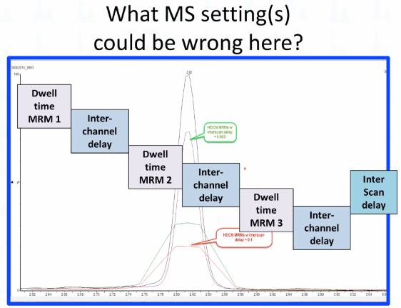 Okay, so I'm going to just tell you right up front, this is not a dwell time problem, nobody changed the dwell time problem here. But that peak looks kind of like the dwell time is too long, right? So what do you think could be the difference here, if you can read the fine print, it's too cheap. It tells you what's there. This is the same vial injected when the problem was discovered, and then after the fix. So when you're we always talk about duty cycle, right? I always felt like when I was first doing mass spec, if I could say duty cycle, it sounds kind of cool. You know, like I knew what I was talking about. But I didn't necessarily really know what I was talking about. And here's the issue, when we build a scan for a mass spec, we don't just have dwell time, depending on your vendor, they might call it a little something. But in between the two MRM, there's something where it's flushing out the collision cell, right, it's getting all the product ions from the previous scan out of the collision cell, so that for the next MRM, you don't have any what we would call crosstalk you don't have anything left for the last scan. So on a Waters TQS system, they call that an inter-channel delay, then we often will build a set of MRMs as a function as a period, whatever it is, you're grouping them together, right for what your purpose. And then at the end, there's something called the Interscan delay, typically, or at least there is with a Waters system. So what happened here is that we our service guy was on site, and he was troubleshooting something. And he thought maybe the problem was the Interscan delay, and he changed it from 3 msec. to 100 msec. And so that's what happens when you do that.