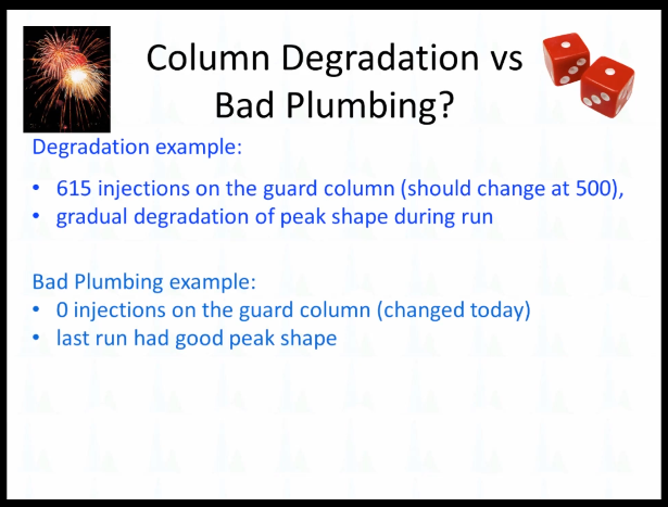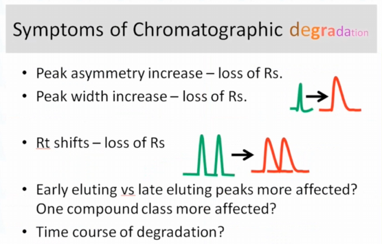 Okay, so if we're talking about symptoms, we've now switched, obviously, to LC problems, we're talking about symptoms of a degradation. One of the things that I like I like Russ Graham, all it says in his course, is the column is a consumable. And so we might think, I can't throw it away. And it has to be said, I have to make it last for 10,000 injections, we have to balance that with how it's affecting the rest of our assay. So we if you have a peak asymmetry increase, if you have a peak increase with the loss of resolution that's going to happen when you have aging of your consumables, same thing, I would say consent to retention time shift. And I've actually seen for us often we'll see things come off a little sooner, the retention time is a little shorter as the column or `the guard column` ages, presumably, to me, because at the head of the column, you have all this matrix residue deposited. I've also seen this scenario where an early eluding peak might be affected, and other peaks in the chromatogram might not be affected. And that can be a little confusing, right, because you wouldn't think it would affect the whole run. But it kind of makes sense, because the early eluting stuff doesn't necessarily comes up sooner to the con because it's not retained as well, right. So it kind of makes sense that it would be that one might be affected first. And the other thing I think that's useful to know is look at the time course of the degradation.