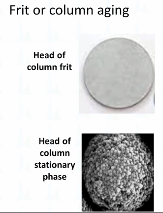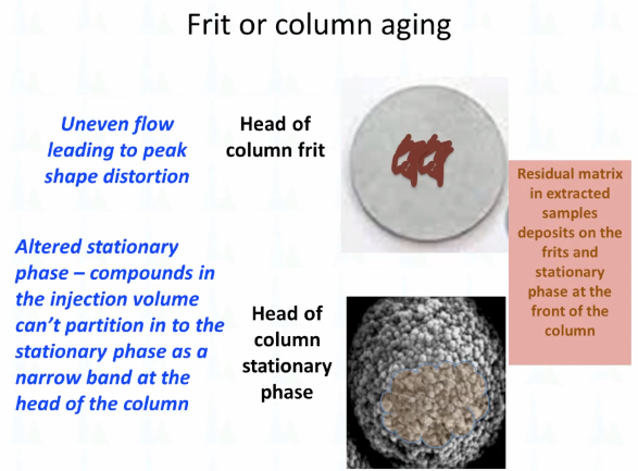 So this is how I think of it is to what's going on, which is you're getting some matrix residue deposited on the frit. And this is an electron micrograph for the silica particles at the head of the column. And so you have both uneven flow and uneven partitioning into that stationary phase instead of that tight, narrow band that you want in order to get a good peek.