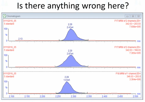Okay, what do you think is wrong with this picture? There is something wrong with it. Let me make it easy for you. Do you think this one's okay. That peak good? How many hands hands? How many people think that's a good peek? Okay. All right. How about this bottom one? The internal standard? You think the internal standard picks? Okay. Okay, so kind of made it easy. So it must be this lag, right? What don't you like about this peak? Kind of spread out? Okay, so it looks like it maybe has a shoulder on it? Would you think if if if there was something wrong with the plumbing or something along like that, would you expect it to affect just one peak rather than all three? I would expect it to. So this seems like something other than bad plumbing, I would say.