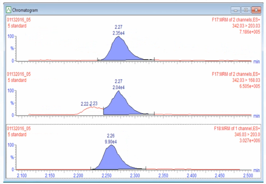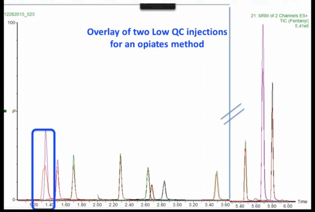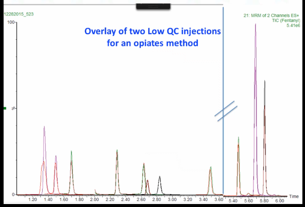 Okay, so the people in our short course saw this one already, so you shouldn't cheat and say. So this is an 11 component opiate method that we had. It is I confessed a dilute and shoot method. And I've truncated there's this big wasted space in here between 3.6 and 5, but I'm showing you all the peaks there in a [composite x I see ??]. You can see something looks a little funny. And this is actually two injections, one from one day and one from the next day that are overlaid on top of each other.