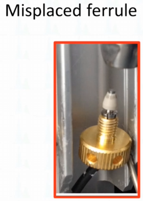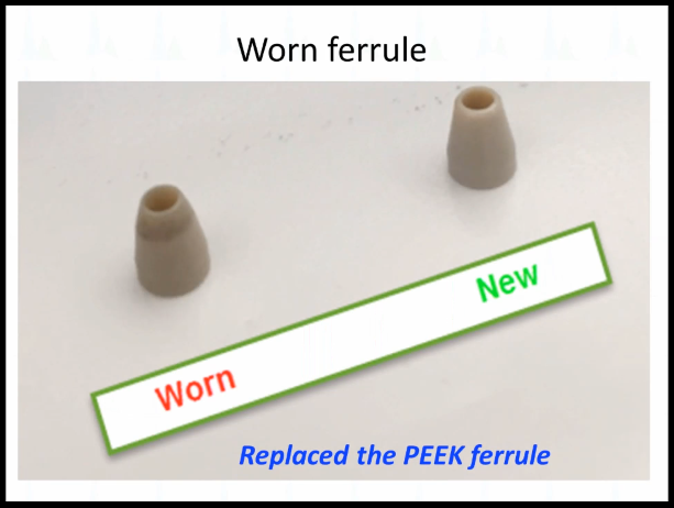 And then the chromatogram, it was like it was a misplaced ferrule and a chromatogram went back to what it was supposed to be. So I think that's one of the lessons I've taken away from working with a UPLC system, it can literally be microliters of difference or millimeters of difference. And you can have bad chromatography. So this is this is the inlet that I was talking about. This is horrible thing where you stick this non wrench there to hold it. And it has a peak ferrule on stainless steel. And so the position of that ferrule makes a big difference. And that one is too short, right, there's a space between the ferrule and the nut. And this one is correct. And that I've seen that much difference really make a smear on the baseline become a peak when you correct it.