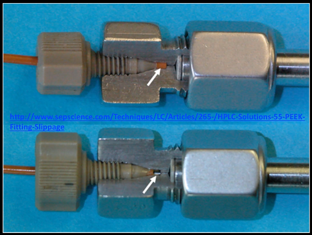So this is my personal favorite photograph. This is the one we talked about. It's from sepscience website. If you Google it, you can find it. So this is what you want to peak connection or in fact a stainless steel connection to look like right the tubing should be butted up right against, they call this the meeting port it's in as far as it can go, it's pretty easy to get it like that it's the first the this hard part is making sure it stays like that while you tighten the fitting down. And here there's a gap, you're never gonna see this gap. But this gap will cause you those kinds of problems that we're seeing, right? That's why it's important to learn how to do fittings correctly.