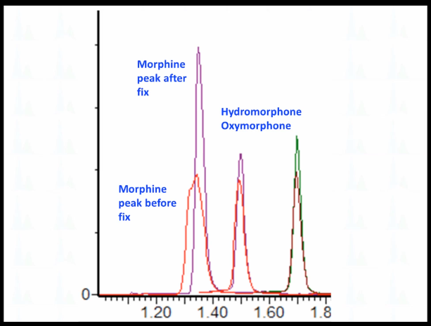And if we zoom in, this is the earliest saluting peak morphine and this is the problem peak. And that's what it looks Like after we fixed it injecting exactly the same vial. And the next two peaks. This is oxymorphone, and this is hydromorphone. And you can see that although this peak, these are the second injection is a little bit lower, the peak shape is really not affected at all right? It's perfectly overlaid. It's not that wide. So what do you think could be going on here? Why is this? Why does this morphine peak affected strangely and not the rest of them?