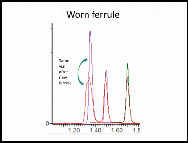 And then it went to that. I personally that's the first time I've ever seen that, that that small of a difference would affect just one peak like that. But that's literally all that happened. We just replaced the ferrule and everything else was good with chromatography. So I think the other lesson that I would take from this is what happened that morning is that somebody had changed `the guard column` here. So we did not change `the guard column`. When we fix it. All we did was change the connection. But I think every time especially with a UPLC system that somebody touches a connection, you have to be suspicious that something might go wrong with it. Has that been your experience? Well, it's that touchy. Yep.