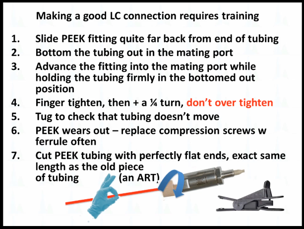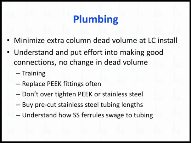 Okay, so minimize your extra column volume at the time of the LC install, I would not assume that the vendor is necessarily going to pay that much attention to it. Not everybody cares that much about extra dead volume. So you may have to interact with the service guy to to let him know that's a priority for you. You need to know how to make good connections so that you don't increase the dead volume, you're gonna have to train people, peak fittings don't last forever, they may be pricey, and so it makes you nervous to use it twice and then throw it away, but definitely they age. If you over tighten peak, it's just going to last for a shorter amount of time. If you finger tighten it and then do a quarter turn that should be enough. I would advise you to buy pre-cut stainless steel because it's pretty hard to cut stainless steel on your own and figure out how to get stainless steel ferrule to switch to tubing in the correct length like I was talking about.