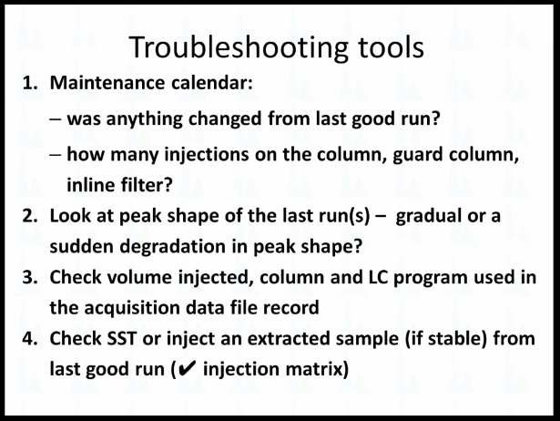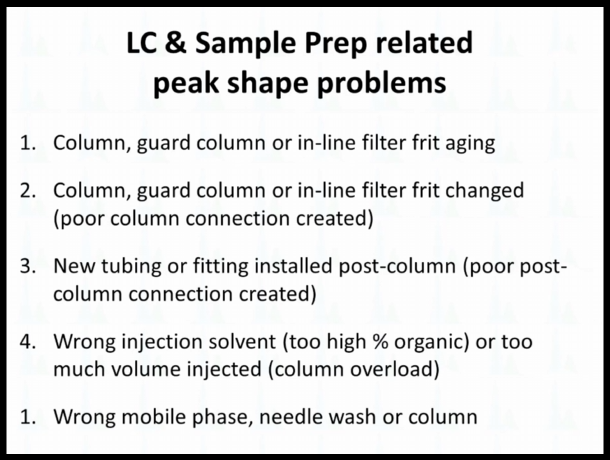 So what we talked about was column guard comm or online filter aging, and a filter can give you that same type of problems, not just the guard, or that you changed it and made a bad connection that you had new tubing or fitting installed post column. And that can also cause a problem wrong injection solvent or the wrong mobile phase, needle phase or column.