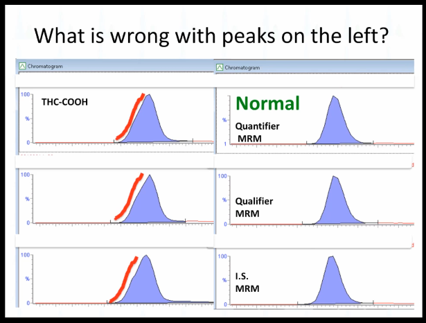 And so it was the wrong injection matrix. This is a solid phase extraction for marijuana metabolite. it's supposed to be reconstituted with 70:30 acetonitrile:Water. Instead, it was reconstituted with 100% of acetonitrile. Okay, so in 100%, acetonitrile, essentially, the THC kind of likes the mobile phase more, that's how I think of it. And so it doesn't adhere in a tight band to the head of the column. So we had to re extract the whole batch, and then it was okay.