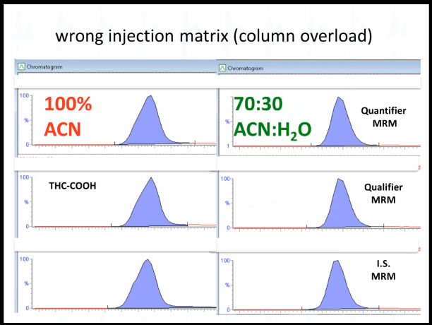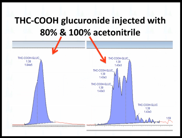 If you're looking at something that's more nonpolar, like THC-COOH glucuronide, we're looking at the free acid metabolite there. It can get this kind of a fronting or even this, this is how bad it looks, you don't even get a peak, you just get a blob, when the percentage of acetonitrile is too high.