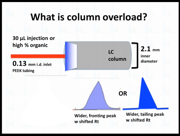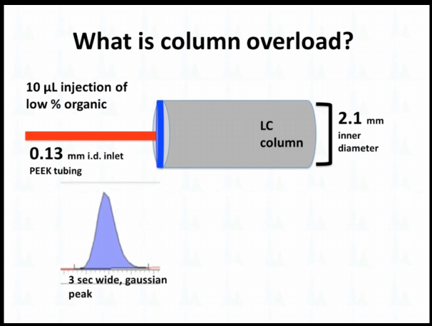 So sometimes I've talked to people at column overload, and I just wanted to they're not so sure what I'm talking about. I just wanted to illustrate that a little bit. So if we do it, right, if we inject the right volume at the right, organic, we get this tight band, and then it forms a nice narrow Gaussian peak. If we're going to inject too much volume, or if it's too high of a percent organic, again, we're talking reverse phase is our default, we're going to see something like this fronting peaks, or wider tailing peak that sometimes has happened.