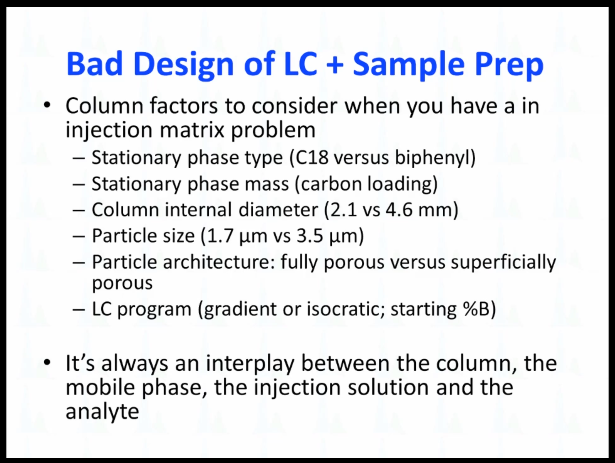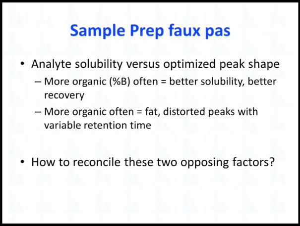 And to me, this is really just bad design of your LLC and sample prep. So I think the I'm just going to step through these quickly, I'll post these on the on the website as well. But my experience is that with a gradient analysis, you can't just say, this is going to be too much organic, you really have to take into account your starting conditions on the gradient, your stationary phase, the inner diameter of the column, how much volume you're injecting, and even your analyte.
