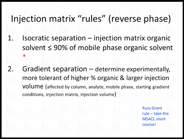 So for isocratic, Russ Grant rule is an injection matrix of organic solvent that's less than or equal to 90% of the mobile phase organic percent. So if you're running at 40%, acetonitrile, then you want your injection matrix to be no more than what is that 36%. And as I said, for gradient, I encourage you strongly not to say Oh, I couldn't possibly I'm starting at 30% V, I couldn't possibly inject anything more than 30% V, I think you absolutely can do that. And potentially give yourself a lot more flexibility.