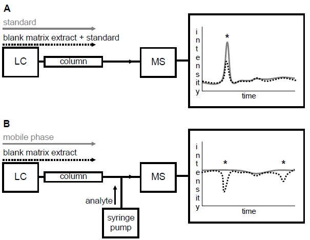 In the post-column infusion system, matrix effects are determined by comparing the signal of a blank sample and a blank matrix extract which are injected into the LC system while the analyte is continuously infused into the column eluent before entering the mass spectrometer (fig. 1B).