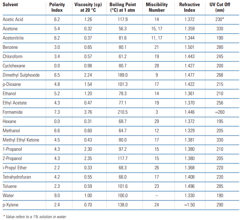 The following tables list a series of commonly used HPLC solvents and their most pertinent physical properties, including viscosity and miscibility number. The miscibility numbers can be used to predict the miscibility of solvents.