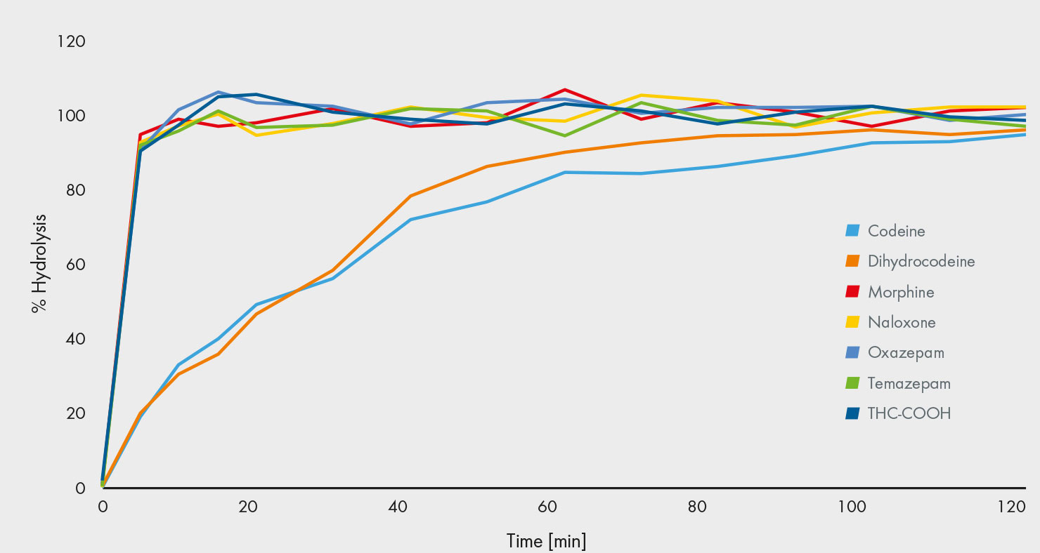 In the human body, many drugs undergo glucuronidation, which requires an enzymatic or acidic hydrolysis prior to the analysis – a challenge for many assays. Enzymatic hydrolysis varies in its effectiveness depending on the drug and the enzyme [2]. Erratic quality assurance results for codeine – one of the more difficult to hydrolyse compounds – are considered to be based on an incomplete hydrolysis [3]. Consequently, some papers recommend the use of an acidic hydrolysis, however, this can degrade both opioids and other substances [4]. Furthermore, this approach can convert oxycodone to oxymorphone, and codeine to morphine by demethylation, which increases the risk of false-negative or false-positive results. To overcome this drawback, our lab has developed an enzymatic hydrolysis process that is effective for hydrolysing all glucuronides within 2 hours. This has been achieved by using a carefully selected enzyme that ensures a complete and selective hydrolysis of all 106 drugs that are covered in the assay, including codeine. The effectiveness has been demonstrated by measuring the hydrolysis of several substances over time: Easy-to-hydrolyse glucuronides become fully hydrolysed quickly, while others, such as codeine, require longer. After 2 hours, the hydrolysis is complete for all the compounds (Fig. 2).